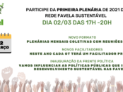 A Rede Favela Sustentável vai inaugurar sua atuação em 2021 com a realização da sua 1ª Plenária Mensal na terça-feira, 2 de março, das 17h-20h, no Zoom! Este ano