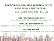 29 de abril de 2021—Antes de relatarmos o que aconteceu na 2ª Plenária da Rede Favela Sustentável abaixo, pedimos que já reserve na sua agenda as datas das próximas