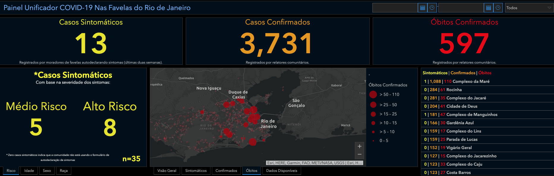 A organização Comunidades Catalisadoras (ComCat), que apoia mobilizadores de favelas em suas lutas há vinte anos, desenvolveu uma parceria com a Esri para criar o painel, disponível em www.favela.info. O Painel Unificador visa consolidar dados sobre casos prováveis ​​e confirmados (combinados em laranja) e mortes (em vermelho) das fontes comunitárias mencionadas acima, dezenas de relatores de favelas em toda a cidade, painéis publicados pelo governo e clippings de notícias. Ele também permite que os moradores relatem seus sintomas diretamente usando um algoritmo de verificação de sintomas, cujos resultados também aparecem no painel (em amarelo).